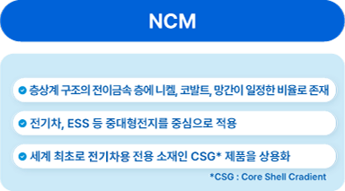 또한 끊임없는 연구개발을 통해 양극소재 기술 향상을 도모하여 차세대 양극소재인 CSG(High-end NCM)를 양산하여 글로벌 전기차 시장 공략에 박차를 가하고 있습니다.