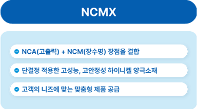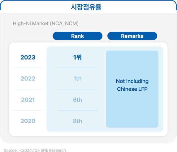 더불어 시장 다양한 Needs 반영하여 미드니켈(Mid Nickel), LFP, Sodium 전지 소재도 함께 준비하여 최고의 양극재 라인업을 준비하고 있습니다.