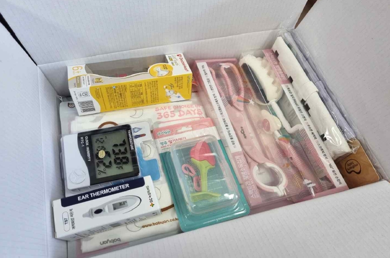 이번 후원물품은 작년 대비 육아 실생활에 조금 더 적합한 품목들을 추가하여, 접촉식 체온계, 아기띠, 속싸개 등 육아에 꼭 필요한 물품 총 13종으로 구성되었으며,