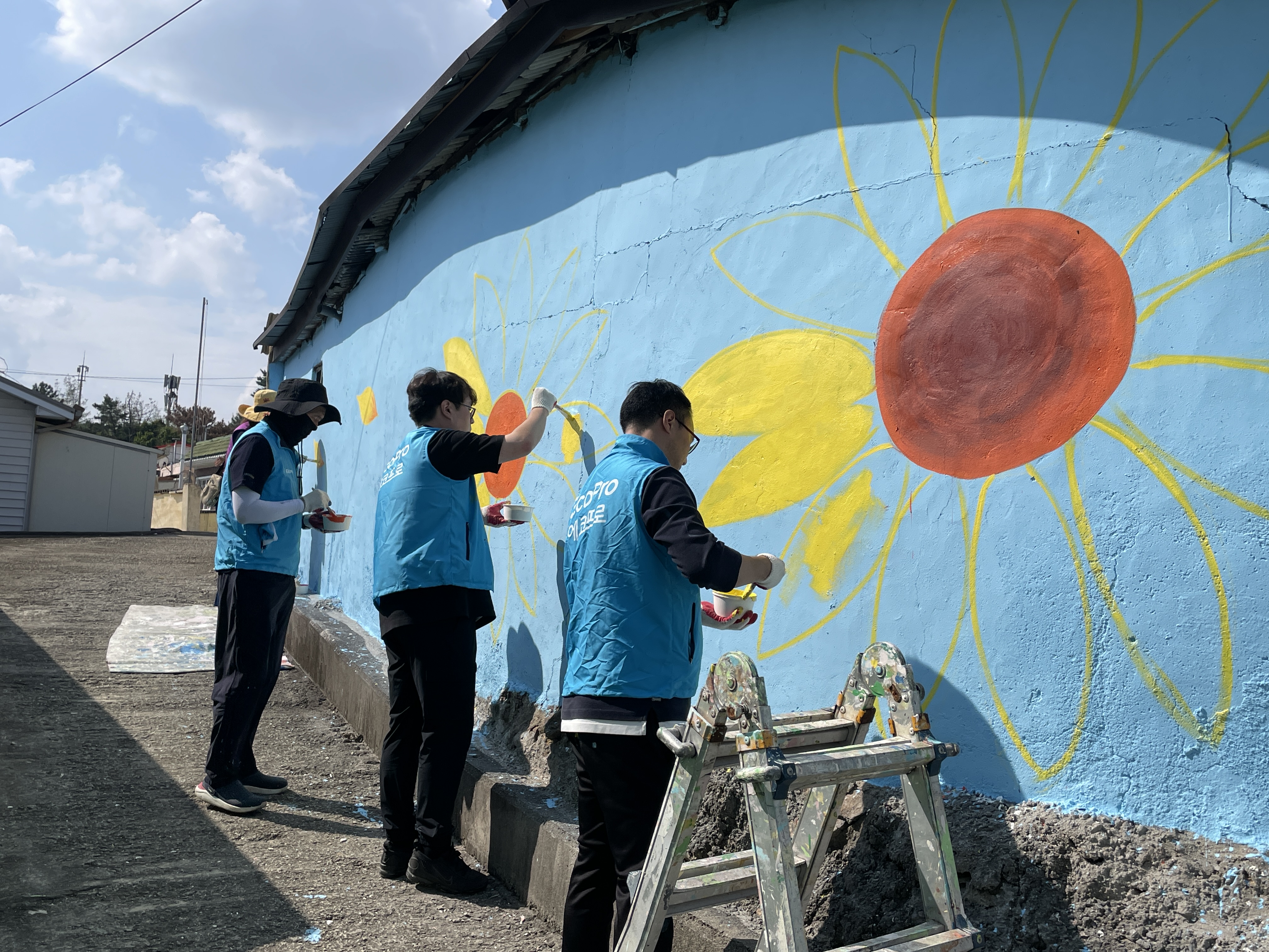 행복마을사업 지원과 더불어 진행된 벽화그리기 봉사활동으로 오래된 벽면을 새로 도색하고 화사한 그림을 그려주며 마을에 생기를 불어넣었습니다.